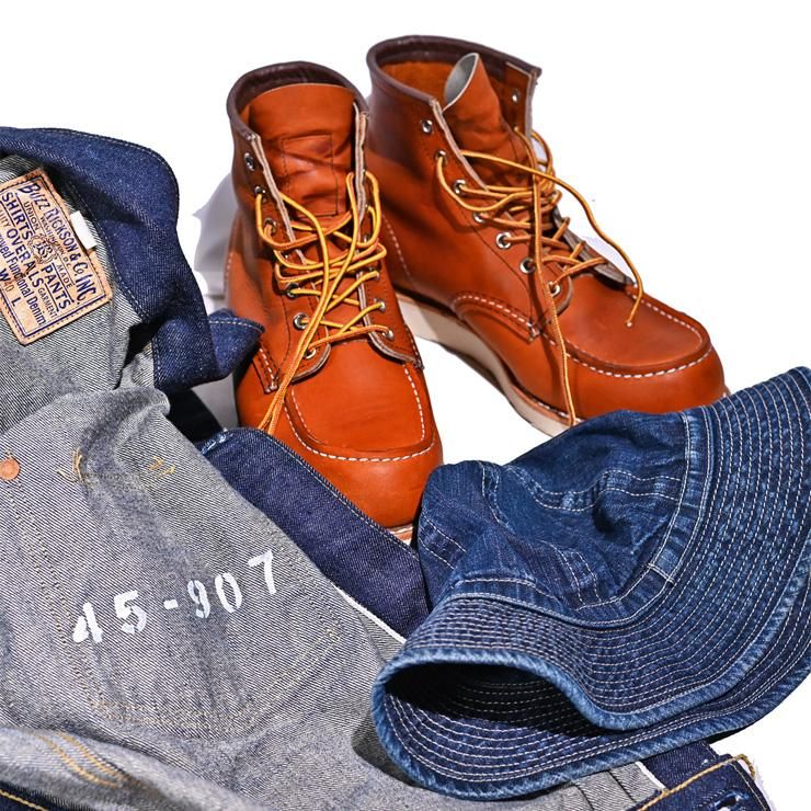 3点とも私物ですが、今一番着ているお気に入りです。バズ・W.W.2デニムブルゾンは着ていて本当に楽しいです。若い頃から38in/Mばかりでしたが、このType1ジャケットは40in。腕が長い自分でも袖丈が十分に足りるし、カバーオールジャケットの様に余裕が出る肘から下の筒形状もワークウェア候で気に入っています。それと合わせるレッドウィングNo.875は明るめなので水滴などには気を使いますが、乾けばそれも染みにならず落ち着くのでやれやれです。勿論、ブラッシングや適度な水拭き、その後の補油は時々、やっています。余り神経質にならず様子を見ながらやるのがいいんじゃない(笑)。デニムアーミーハットは今の色落ち(遣れ)具合がちょうどいいかな。これからの季節はいろいろな服が着れて楽しいです。