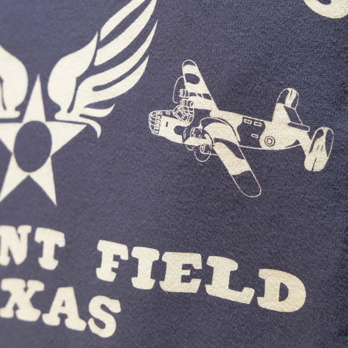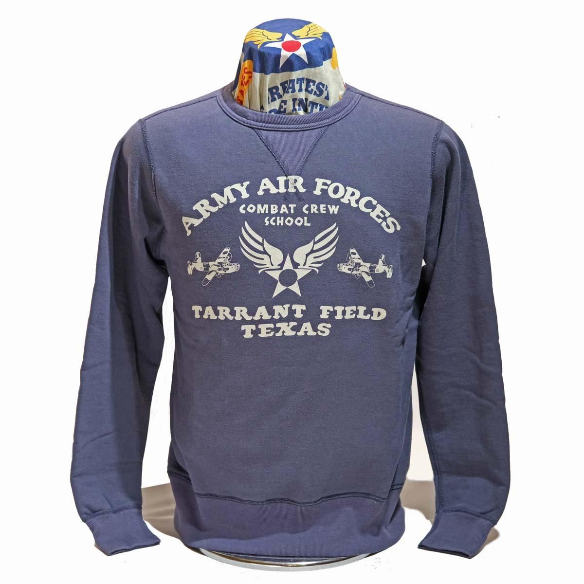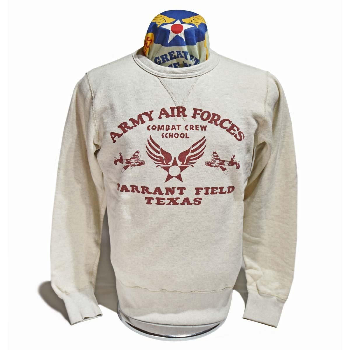 様々なアメカジ衣料の中でも外すことの出来ないスウェットシャツ。柔らかな着心地と身体に吸いつくように着れるシルエットは、秋冬には様々なアメカジアウターのインナー用として愛用されています。モチーフの"ARMY AIR FOECES"はテキサス州に置かれた"TARRANT FIELD"(米軍基地)で使用されたものでしょうか、マニアックなリベレーターが描写されています。TYPE^A-2は勿論、B-10やB-15などの大戦期フライトジャケットに合わせたいですね!