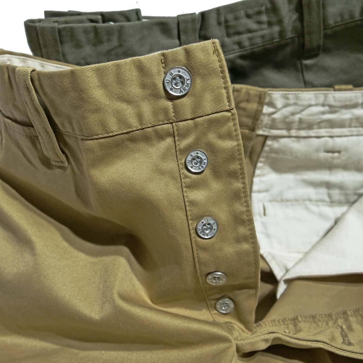 元々ミリタリーパンツであったチノトラウザースを民間用(シビリアンモデル)としてオリジナルに置き換えたトロフィークロージング。コシの在るパリッとした質感の生地、U.S.ARMY刻印入りアルミソーイングボタン、ウェスト帯の縫製処理などはミリタリーチノから継承するディテイルです。特徴的なのはそのシルエットで余裕を持たせた腿周りと膝から裾へのテーパードはミリタリートラウザースとは異なった独自のシルエットです。画像では32inを試着していますが、現代的なジャストフィットシルエットに仕上がっています。