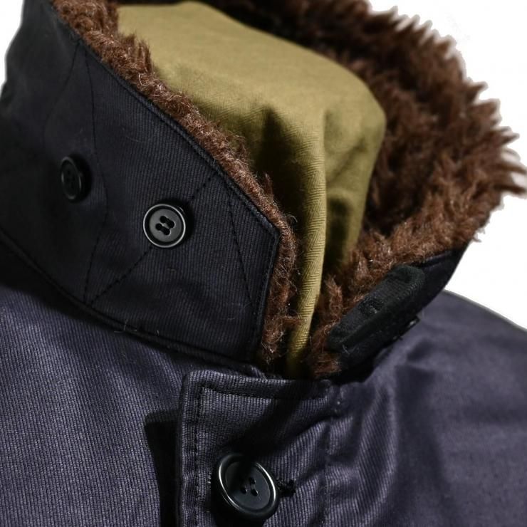 背面に"U.S.NAVY"のリフレクタープリントが入る通称1stモデルです。袖口までアルパカライニングが使われる初期モデルのディテイルを持つ希少さも魅力です。ヴィンテージのネイビーカラーを再現すべく幾度となく試作されたジャングルクロスやアルパカファーライニングなど、そのコンセプトからすればこの価格にも納得がいきます。