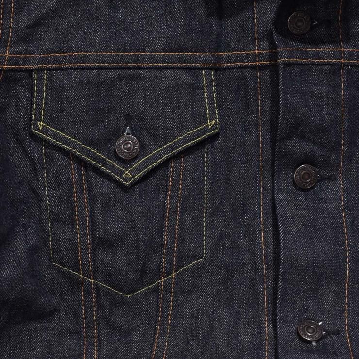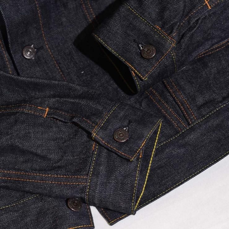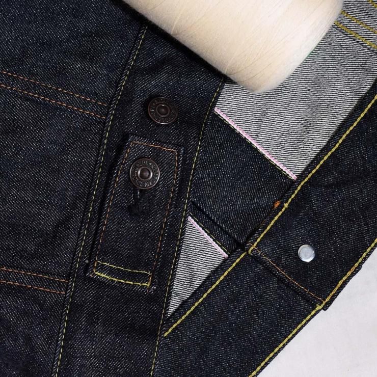 生地:14.25oz.サンフォライズド右綾デニム、カッパーメッキタックボタン、オレンジ×イエローのツーモーションステッチ縫製