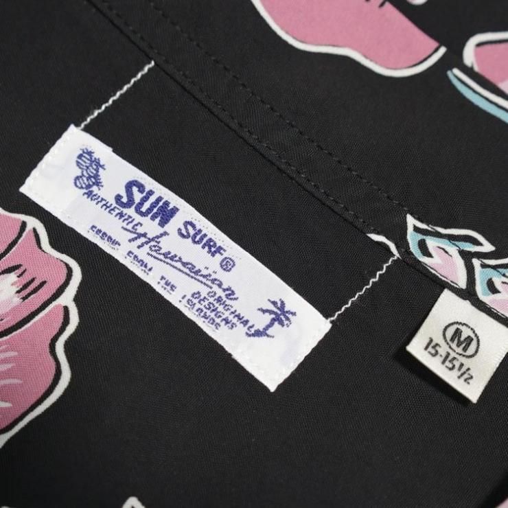 1940〜50年代のヴィンテージハワイアンシャツ(アロハシャツ)の図柄を再現し現代に蘇らせている日本製ブランド・SUN-SURF(サンサーフ)のご紹介です。SS39425は1950年代中期、MADE IN CALIFORNIAの作品の復刻。王道のボーダー柄でアンスリウムとその他の南国の花が描かれる、まさに王道なデザインパターンなのは言うまでも無いですが、この王道なパターンがやっぱりアロハシャツ!としてしっくりくるパターンの方も多いのではないでしょうか?そしてどこか和のテイストも感じられるような花の雰囲気もこれまた非常に惹かれる要素!一見よくあるパターンに見られがちですが、それぞれにデザインされる柄が違う、だからこそやっぱり王道なイメージのアイテムは押さえたいんですよね。