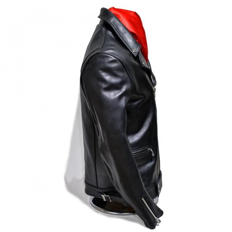 ここでご紹介する"LJM-8"はフロントフラップを持つUKスタイルのライダースジャケット、腰に付けられたサイドベルトを調整することで腰幅のフィット感が変更できます。ストレッチ性のあるブラックのポリエステルサテン裏地は滑りも良く着易いのが特徴です。