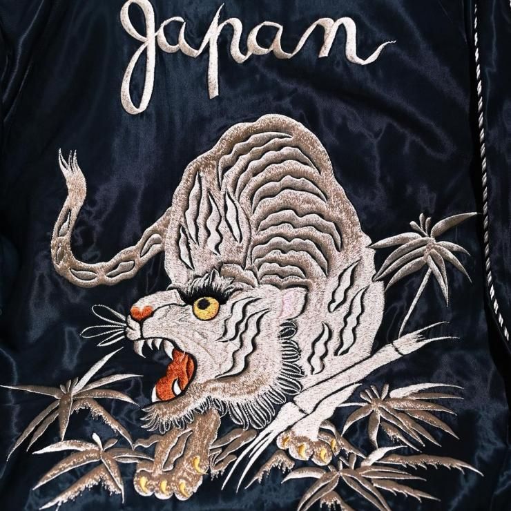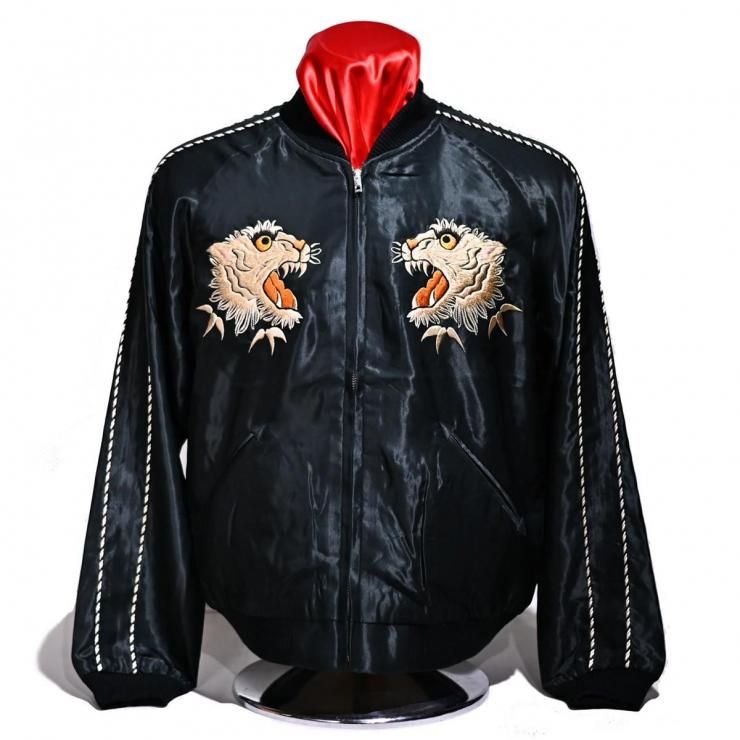 1950年代中期を代表する白虎の絵柄は、虎斑の縞模様をあえて刺繍で埋めずに生地のブラックを部分的に見せることで輪郭を強調して立体的に表現する手法が特徴の1枚。黒一色のボディに漆黒のリブ、黒白のパイピングなどモノトーンを基調としたボディに白虎が映えるシックな仕上がりが魅力。