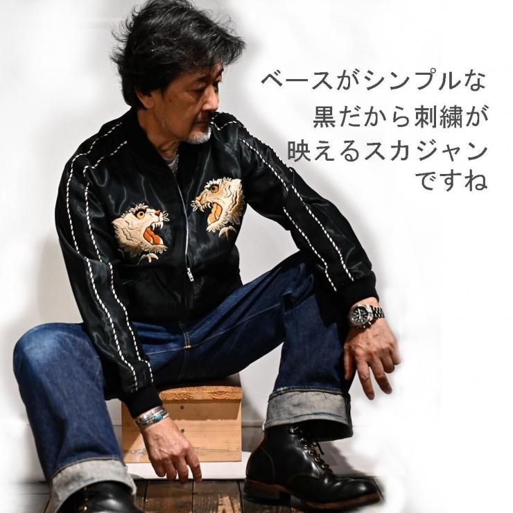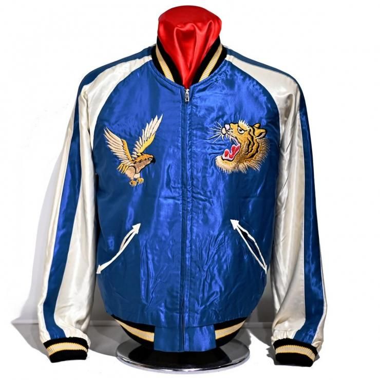 戦後間もない時期、横浜・港町や東京・銀座を中心に巷には着物や帯、ひな人形など、駐留米兵が好みそうな土産物を並べる露店が数多く存在し賑わっていました。その光景を目にした港商(GHQによる民主化政策の一環で財閥解体が行われるなかで誕生した商社)の社員が開発したのがスカジャンの始まりでした。欧米人に馴染み易いベースボールジャケットを模ったウェスト丈のジャンパーに、鷹虎龍などのオリエンタルな柄を刺繍で表現したものでした。