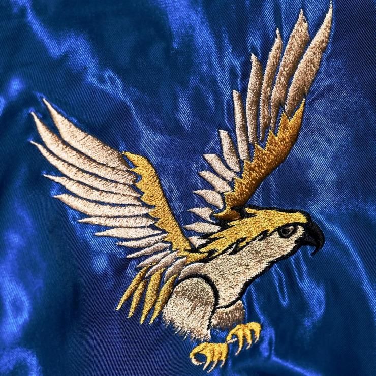 一方、リバーシブル面は晴天を想わせるブルーのボディをベースに波飛沫とともに水辺から姿を現す金龍の絵柄。長い体躯を雲間に隠しながら迫り来るダイナミックな構図は龍の顔にのみに黒いアウトラインを入れることで遠近感と迫力を強調しているのが特徴。胸には鷲と虎が描かれ、スカジャンの三大モチーフである鷲・虎・龍が揃った贅沢な一着に仕上がっています。