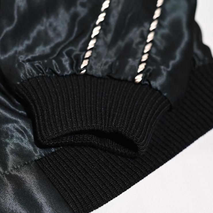 表生地:アセテートレーヨン100%、ライニング:アセテートレーヨン100%、ニットリブ:アクリル100%、刺繍:レーヨン糸、ジッパー:オリジナルデザイン