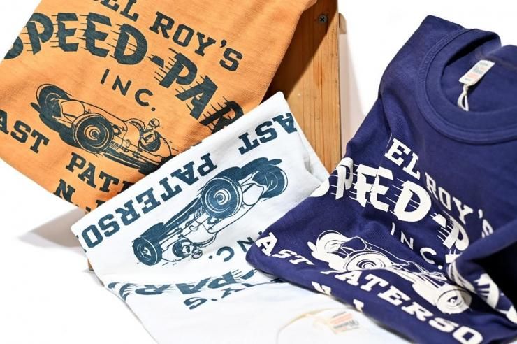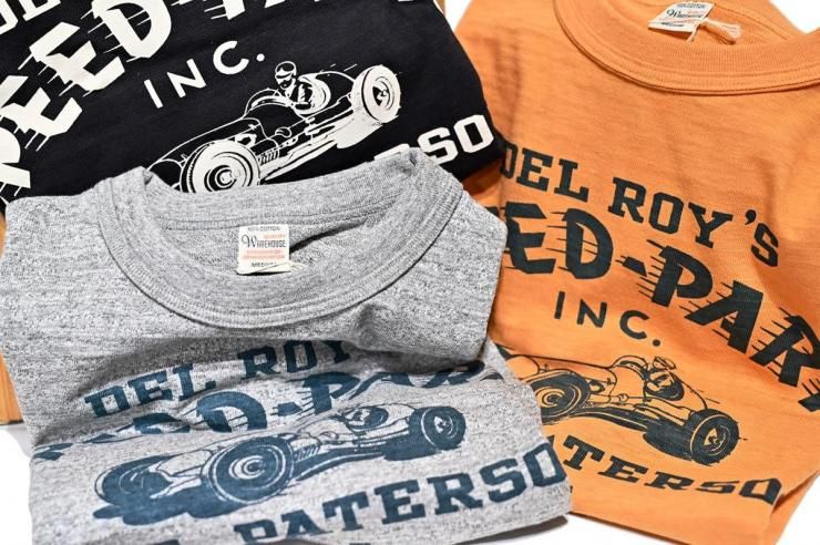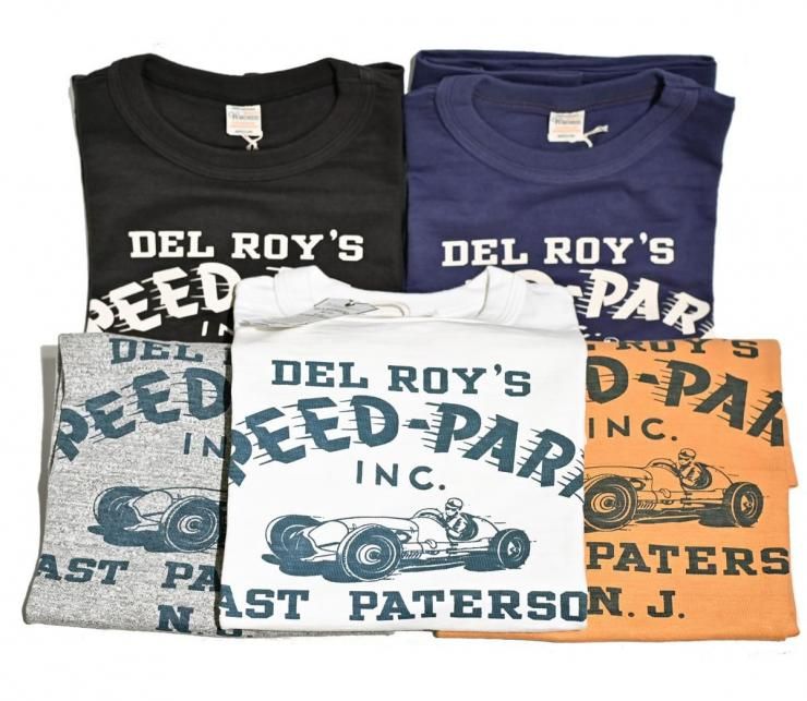 シャドーボーダー独特の柔らかな着心地は多くのファンに支持されています。"SPEED-PARTS"は見てのとおりのモーター系プリント物。オフ、杢グレー、オレンジには染み込みインク、スミクロ、ナスコンにはひび割れラバーインクが使用されたウエアハウスならではのプリント技法が楽しめます。