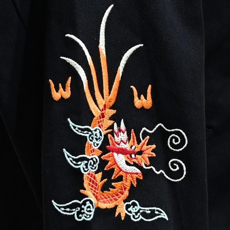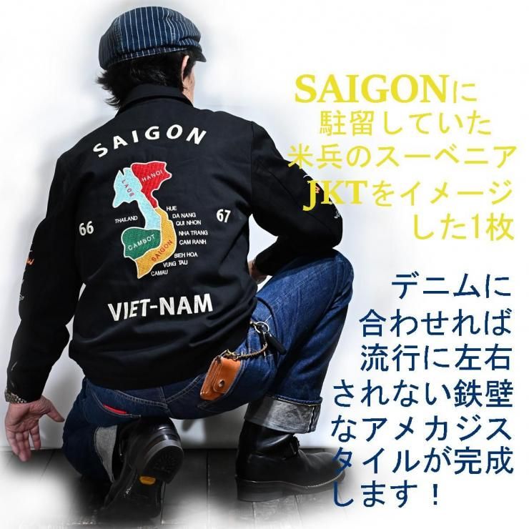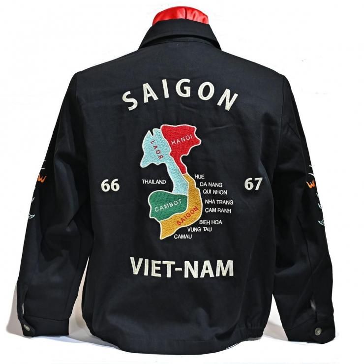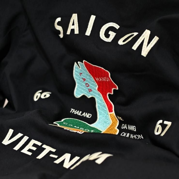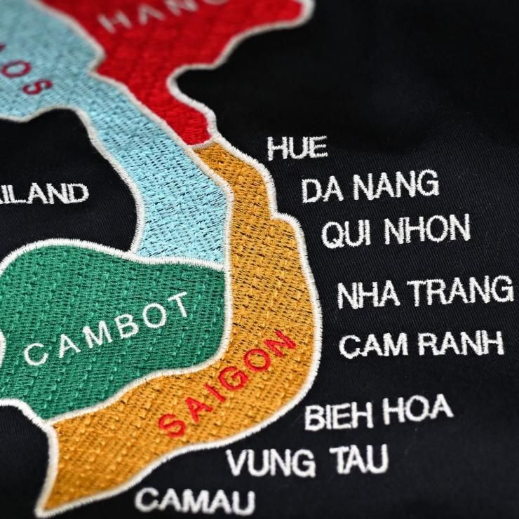 2025年秋冬の新作!肉厚で丈夫なコットンツイル生地に手振り風の刺繍を奢った1枚。ベトジャンの王道的デザインの『マップ柄』をヴィンテージ真柄の配色で仕上げた渾身の1枚です。