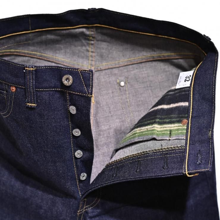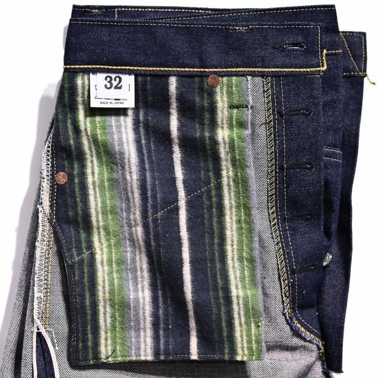 パーツ:鉄製タックボタン、鉄製銅メッキリベット、レーヨン100%先染めライン入りレッドピスネーム、ベジタブルタンニングディアスキンラベル、オリジナルフランネル袋ポケット、ペンキプリントステッチ