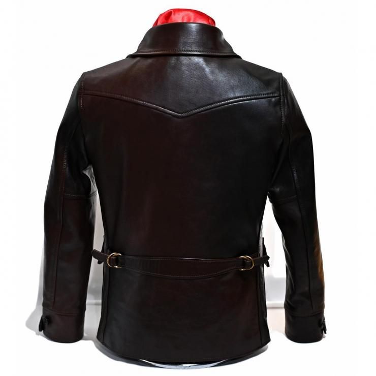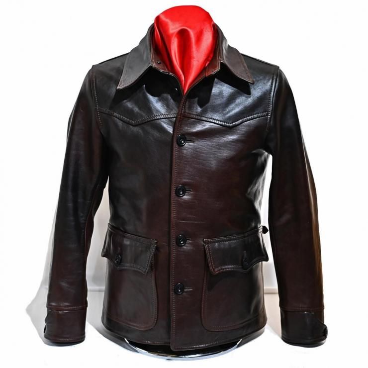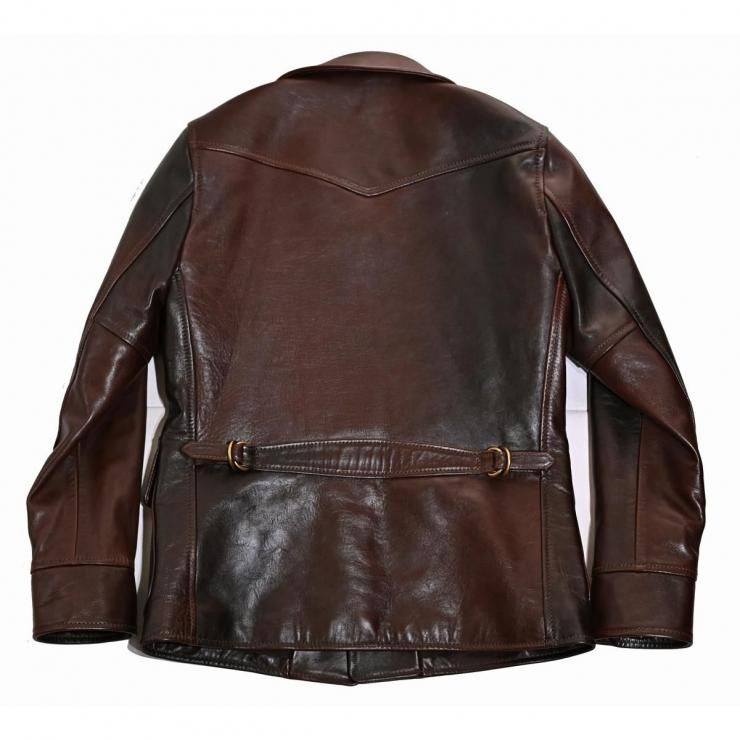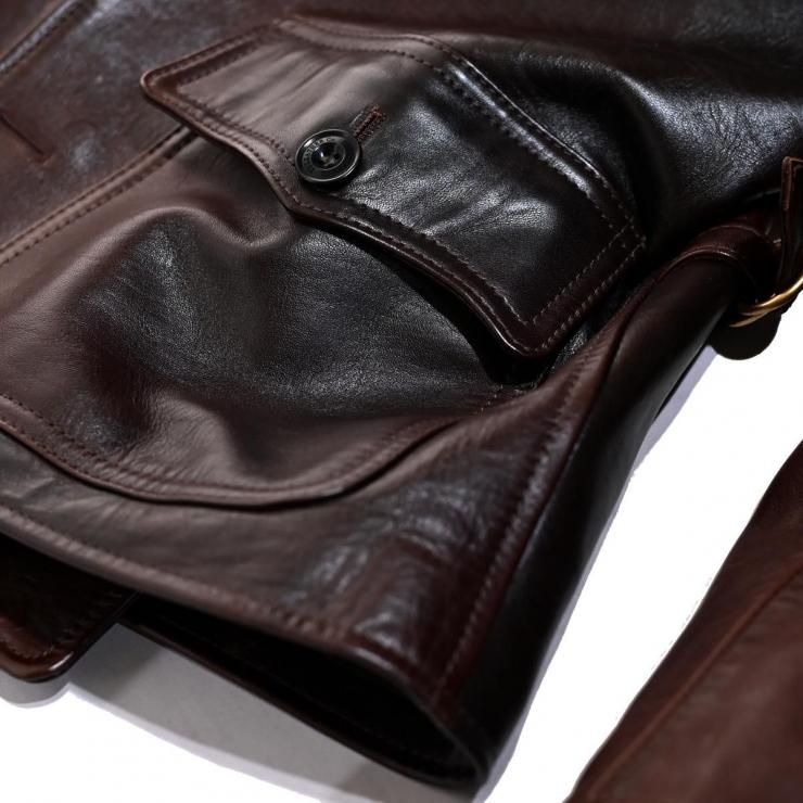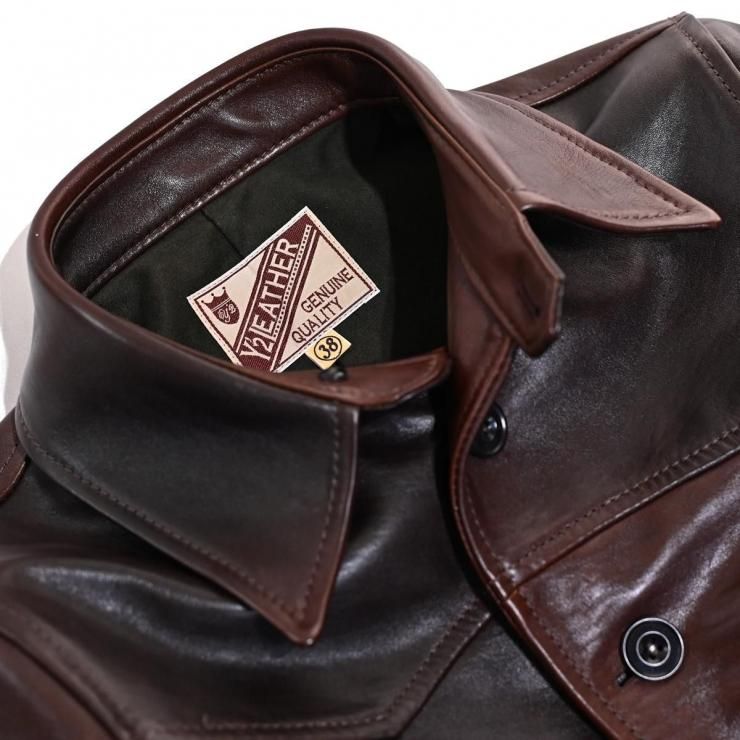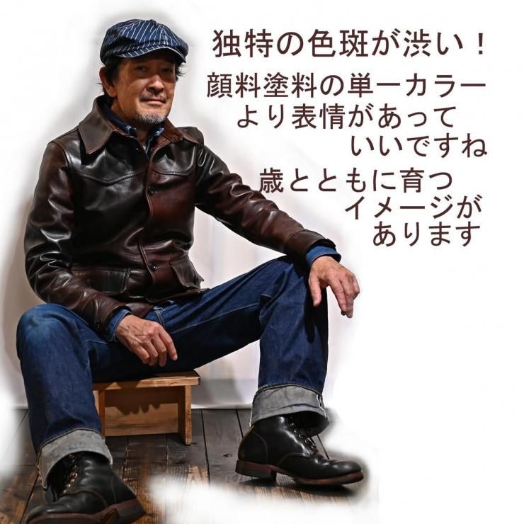 "HNC-82 HAND DYED HORSE CAR COAT"はY'2レザーのラインナップの中ではブランドの『顔』となる代表モデルです。レザージャケット専門のレザーファクトリーとして様々な仕上げが施された多種多様の馬革を手掛ける中で、このハンドダイドホースハイドはエコホースと並び、渋鞣し100%で最もヴィンテージレザーに近い風合いを有する希少なレザージャケットです。アニリン染料を職人の手で丹念に着色していく工程は染料の強弱から独特の色斑と深みのある表情を生み出します。経年変化による擦れやオーナー自身で行う保革作業(補油)で『革ジャンを育てる』至福の喜びが得られることでしょう。
