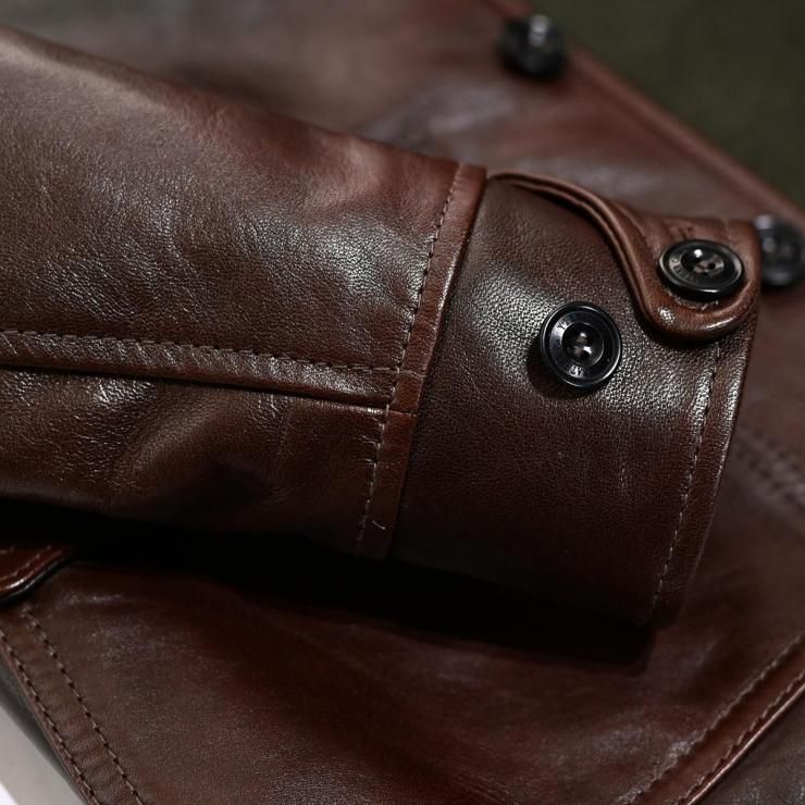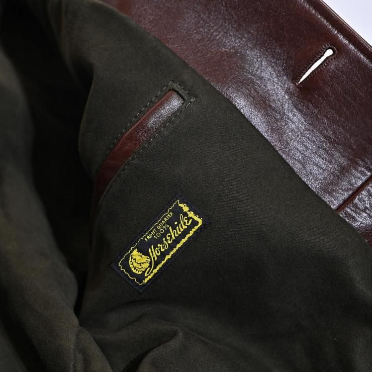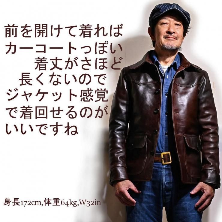 ここでは38inを試着しています。カーコートの名称が付いてもむしろジャケットに近い存在です。前を閉めてビシッと着れば、腕、胸、胴体周りに無数の皺が入ります。1.4mm厚の馬革でも風合いが柔らかいので身体に吸い付かせて着ても辛さは在りません。こんな着方が出来る馬革ジャケットなので"着る喜び"と"育てる楽しさ"の両方が味わえます。オリーブカラーのブラッシュドコットンクロスは丈夫でメンテナンスも容易です。