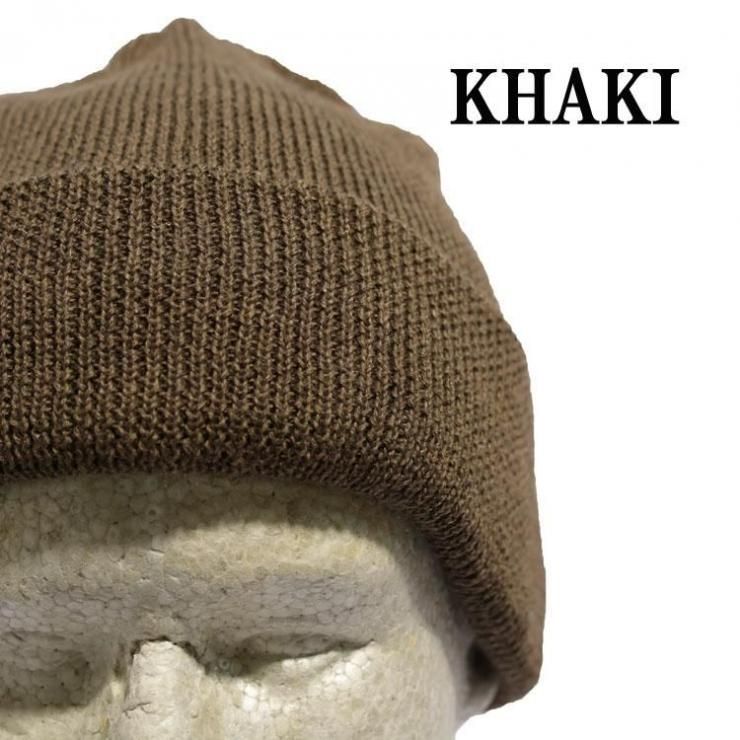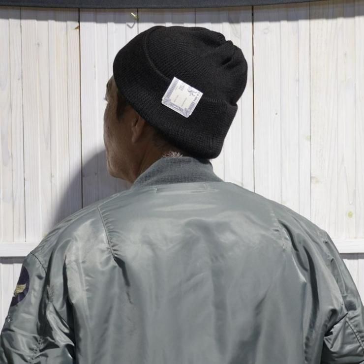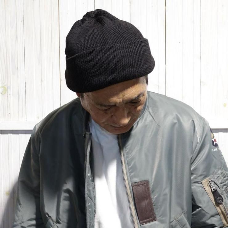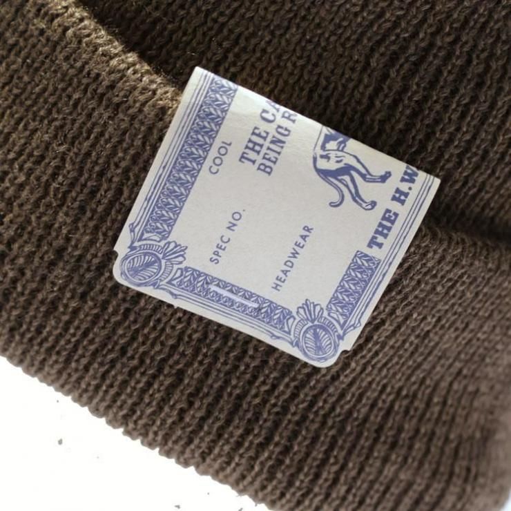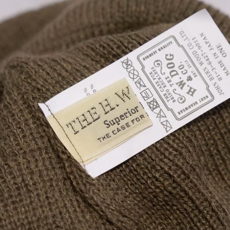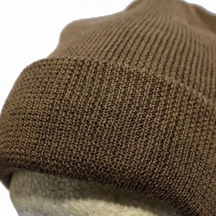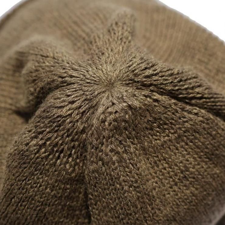 被り方は帽子内側を確認し、つなぎ目を後ろに来る様に着用するのがポイント。また着用時にペーパーラベルが後ろやや左側に来るように被ると形がキレイに出ます。被った時の本当に絶妙な丁度良いテンションと深すぎない帽体の深さ、自在に楽しめる裾のロール幅、編み形状や絞り位置などドッグならではのスタイル感は絶妙。非常に軽さがあり、ややライトな生地厚は、実用性の富んだスタイルとその暖かさ、ウールとアクリルの生地で構成されるアイテムで、つかいやすさの大きな理由の一つです!またテンションも締め付けすぎず、嫌味の無いテンションが被りやすさを体感できる理由の一つですね。