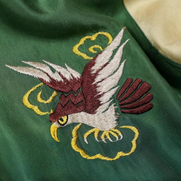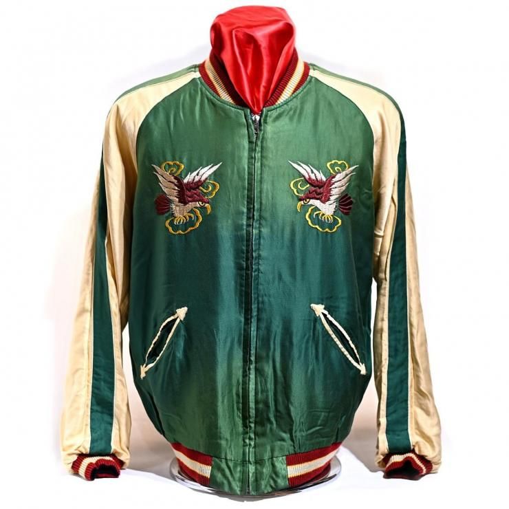 戦後間もない時期、横浜・港町や東京・銀座を中心に巷には着物や帯、ひな人形など、駐留米兵が好みそうな土産物を並べる露店が数多く存在し賑わっていました。その光景を目にした港商(GHQによる民主化政策の一環で財閥解体が行われるなかで誕生した商社)の社員が開発したのがスカジャンの始まりでした。欧米人に馴染み易いベースボールジャケットを模ったウェスト丈のジャンパーに、鷹虎龍などのオリエンタルな柄を刺繍で表現したものでした。