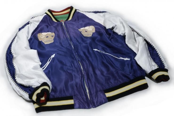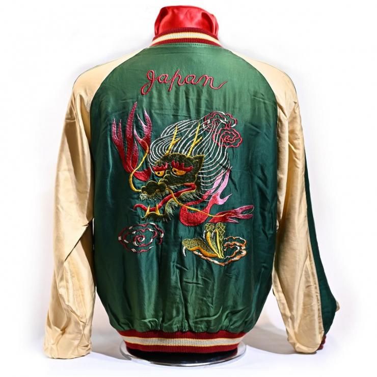 ヴィンテージ市場で現存する個体が少なく希少な存在とされている『髑髏柄』は1950年代中期のモデル。前身と背面中央に陣取る髑髏は、白を基調とした淡い色糸で描かれ、身頃の紺色、袖のオフホワイトとのコントラストの良さがは映える1枚に仕上がっています。共に描かれたヘビは古事記に登場する『大蛇(おろち)』でしょうか。髑髏に負けない存在感を演出していますね。一方、リバーシブル面は龍の頭部を細部まで描写した通称『ドラゴンヘッド』と呼ばれる絵柄。淡いグリーンの龍の顔や朱色の炎など当時の日本ならではの刺繍糸の色味で表現された見事な描写です。グリーンのボディに対して補色である刺繍の赤を馴染ませるため、リブにも赤を配することで全体に統一感が生まれています。